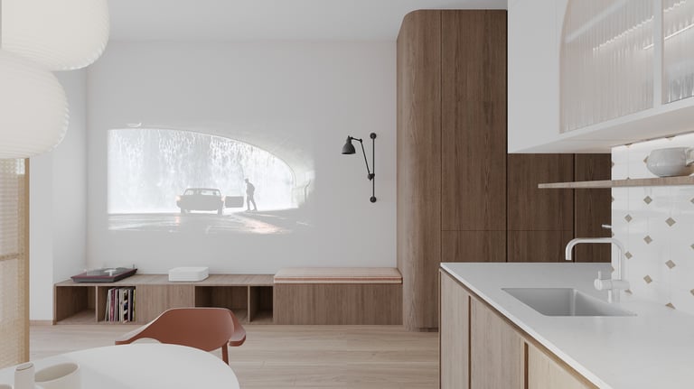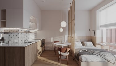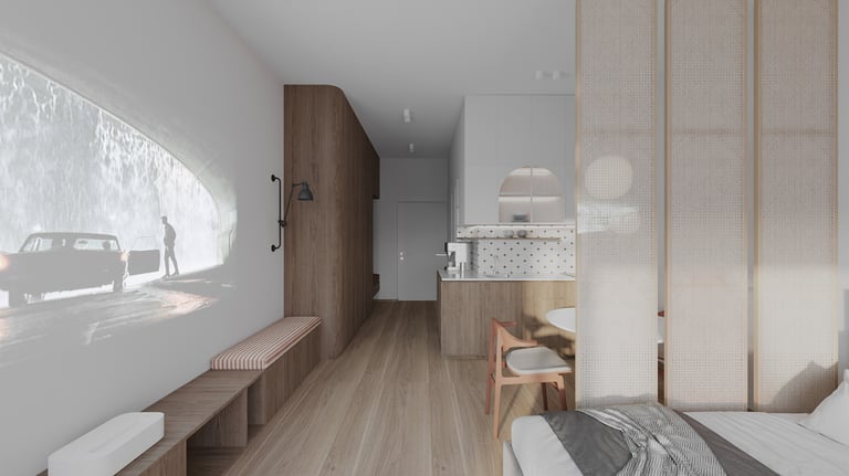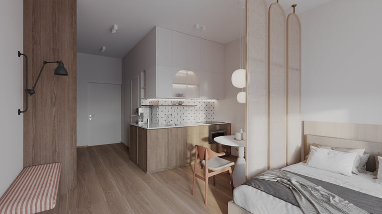 Skylum komplekse, Viršuliškėse, Vilniuje, realizuojamas 26 m² buto interjeras. Pagrindinis tikslas – maksimaliai išnaudoti nedidelę erdvę, užtikrinant patogumą ir funkcionalumą kasdieniam gyvenimui. Interjere dominuoja natūralios, šiltos medžiagos, kurios padeda sukurti jaukią ir harmoningą atmosferą.