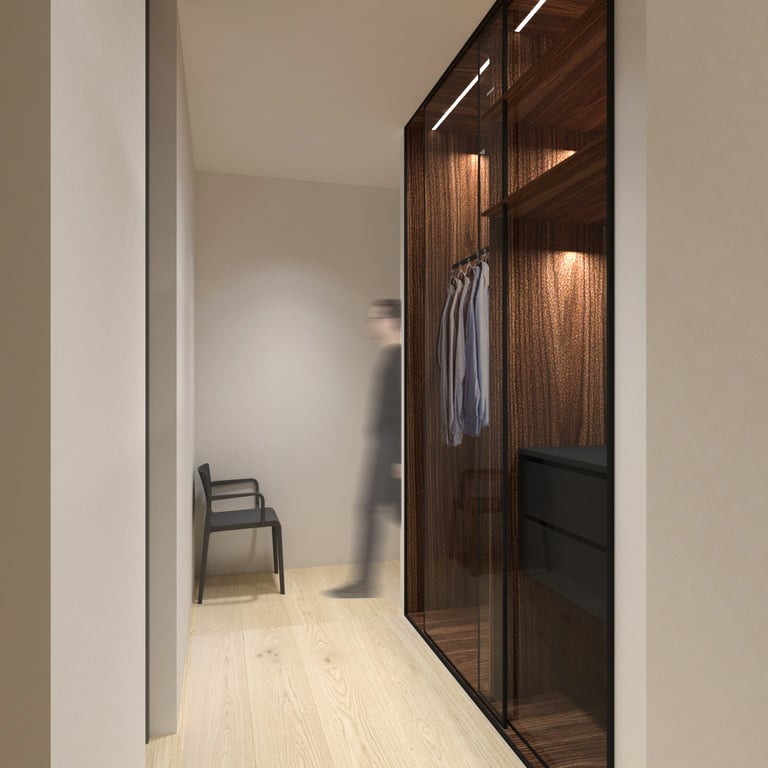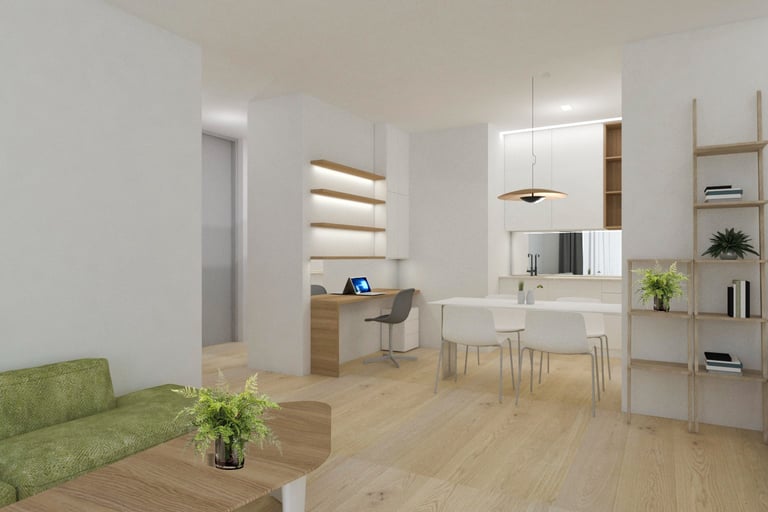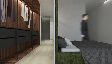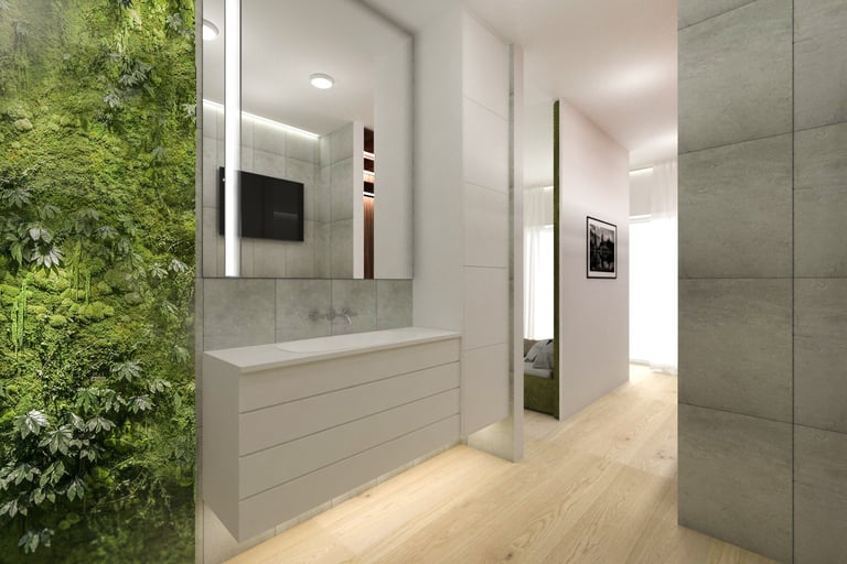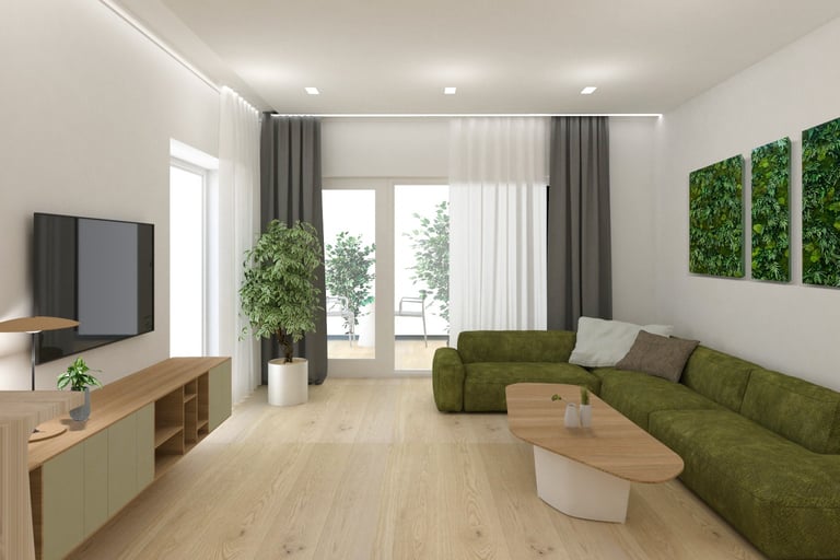 Šviesus, šiuolaikiškas interjeras, kuriame dominuoja šiltos medžio tekstūros ir žalios spalvos akcentai, įkvėpti gamtos. Atviros erdvės, apgalvotas zonavimas ir natūralūs tonai kuria jaukią, harmoningą atmosferą kasdieniam gyvenimui. Integruota žaluma, išskirtiniai baldų sprendimai ir kruopščiai parinktos medžiagos paverčia šį būstą ne tik funkcionaliu, bet ir estetiškai išskirtiniu.
