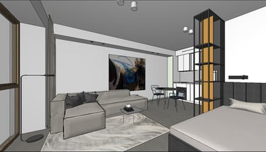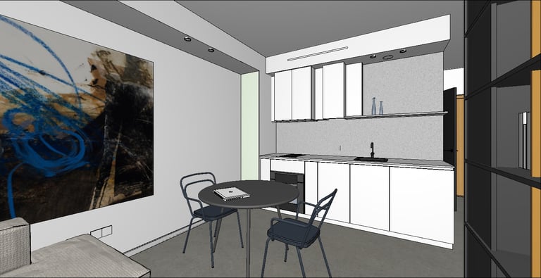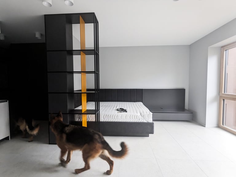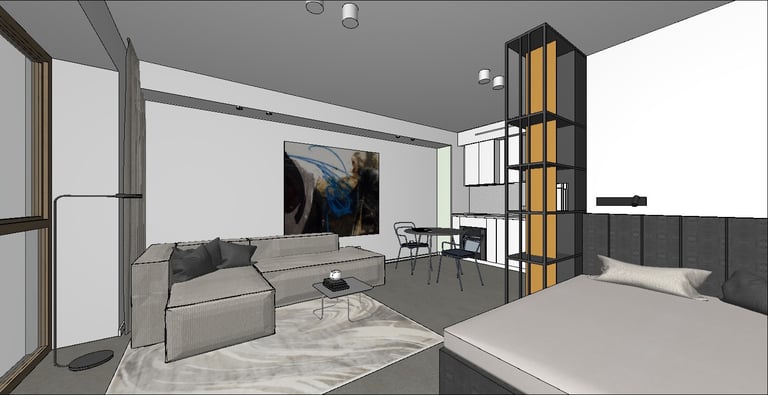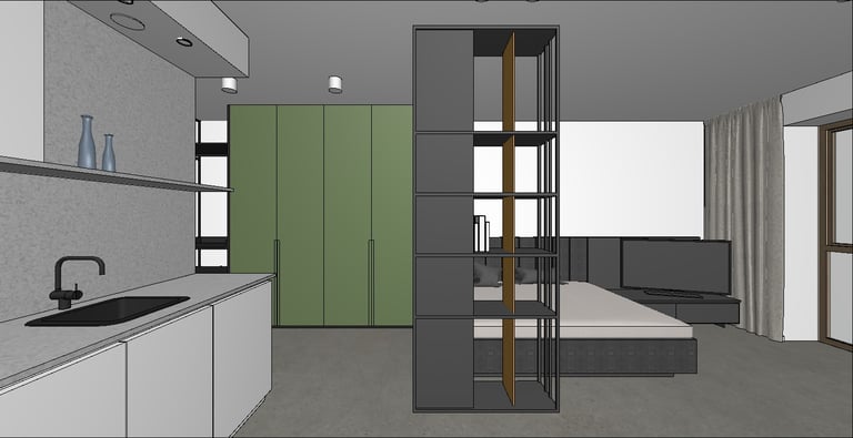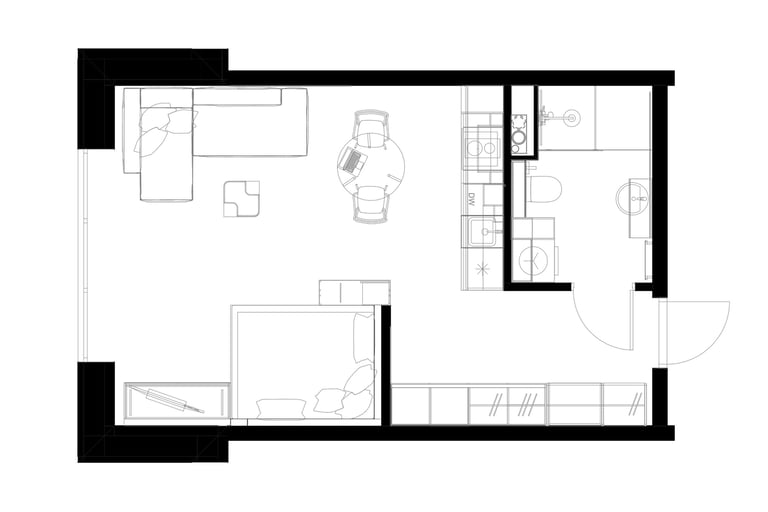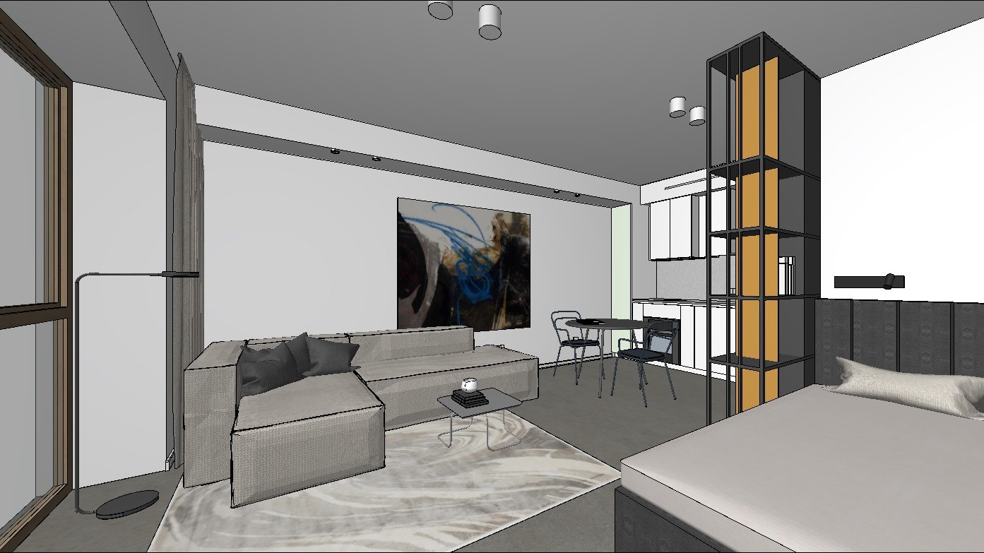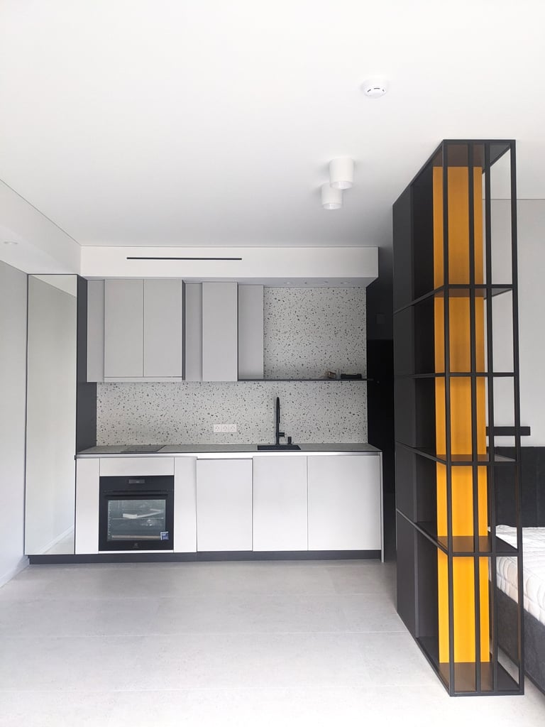 Nedidelės kvadratūros studentiškame bute apgalvotai sutalpinta viskas, ko gali prireikti patogiam gyvenimui. Interjerą pagyvina žaismingi akcentai, kurie suteikia erdvėms individualumo ir energijos. Mažas kambarys funkcionaliai suskirstytas zonomis – jis tarnauja tiek kaip svetainė dienos metu, tiek kaip jaukus miegamasis vakarais.
