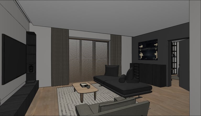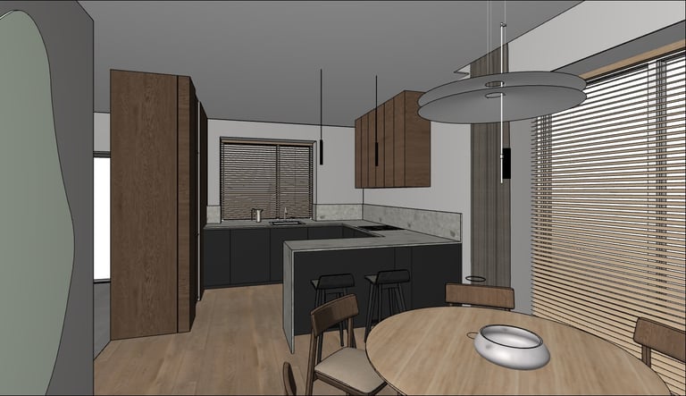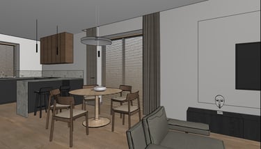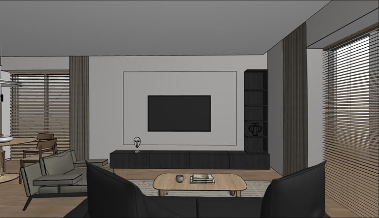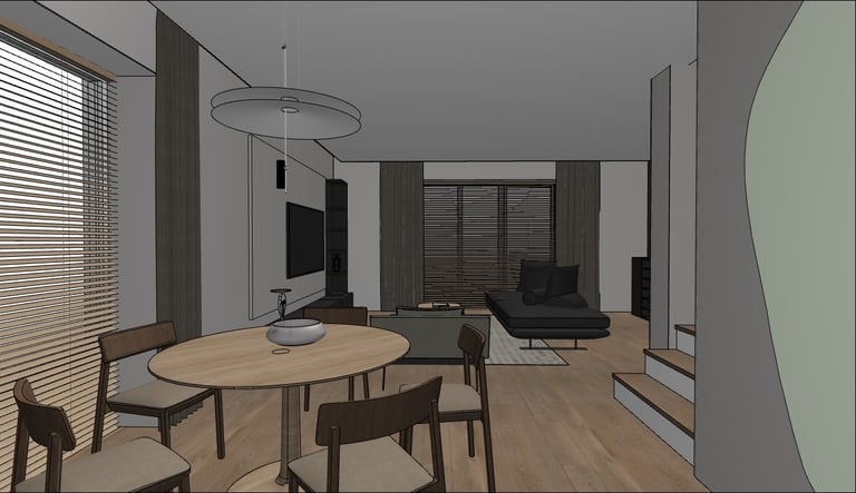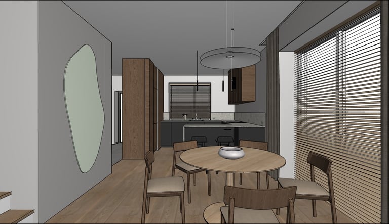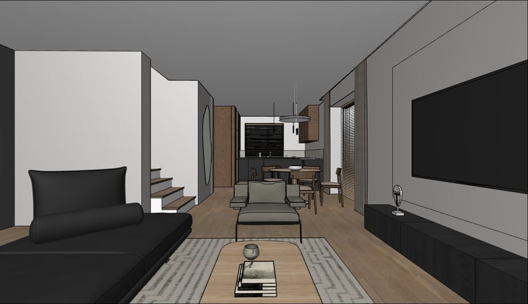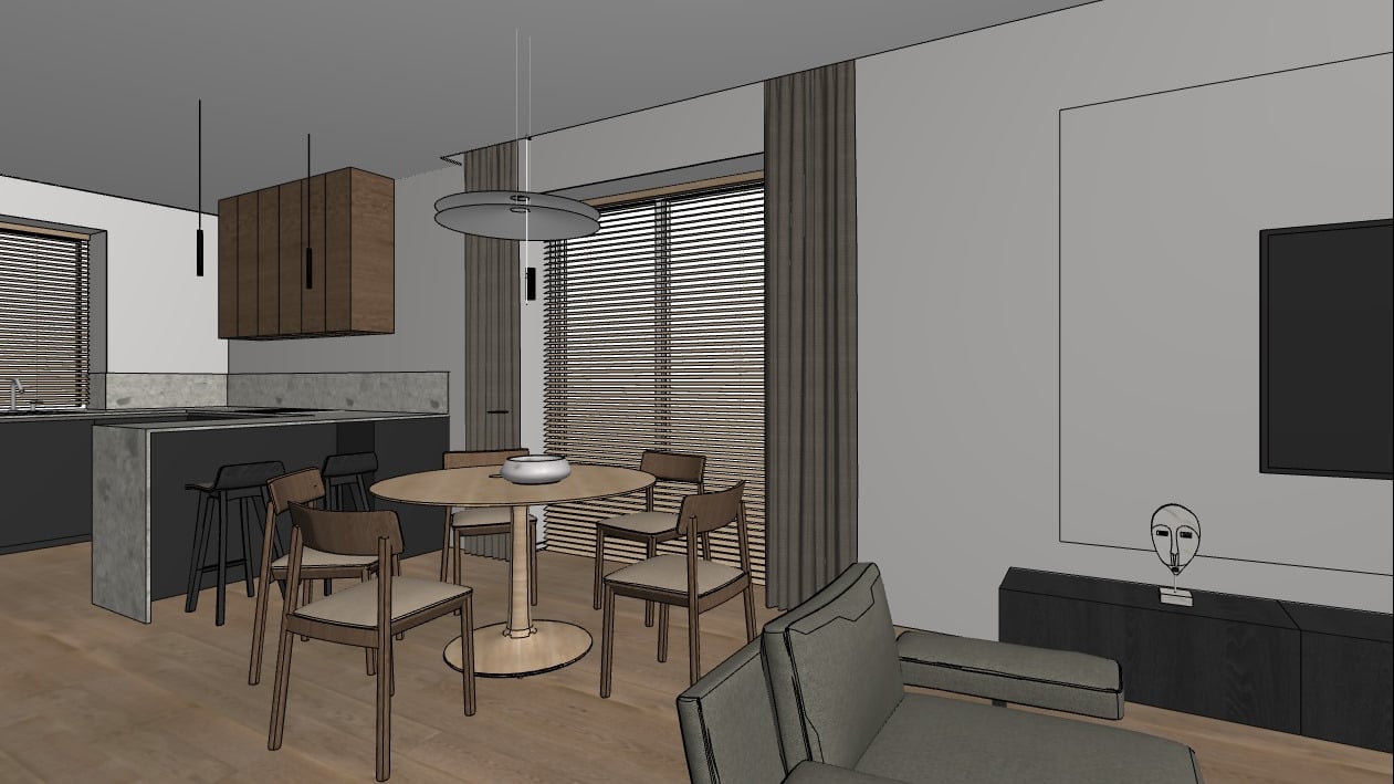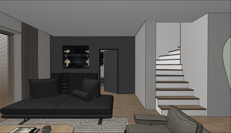 Šis užmiesčio namo interjeras – tai puikus pavyzdys, kaip minimalizmas gali būti jaukus ir šiltas. Jaunos poros norai buvo aiškūs: tamsios spalvos, natūralaus tamsaus medžio akcentai ir erdvė, kurioje gera gyventi kasdien. Kuriant projektą pasirinkome švarias linijas ir subtilias detales, kurios neperkrauna, bet suteikia išskirtinumo. Tamsaus medžio derinys su moderniu minimalistiniu stiliumi kuria solidžią, tačiau malonią akiai atmosferą, o kiekviena erdvė apgalvota taip, kad būtų ne tik estetiška, bet ir patogi.