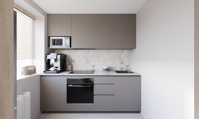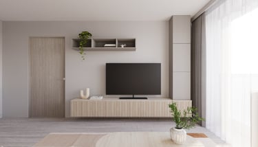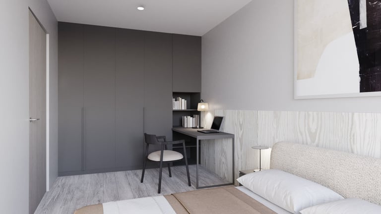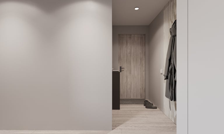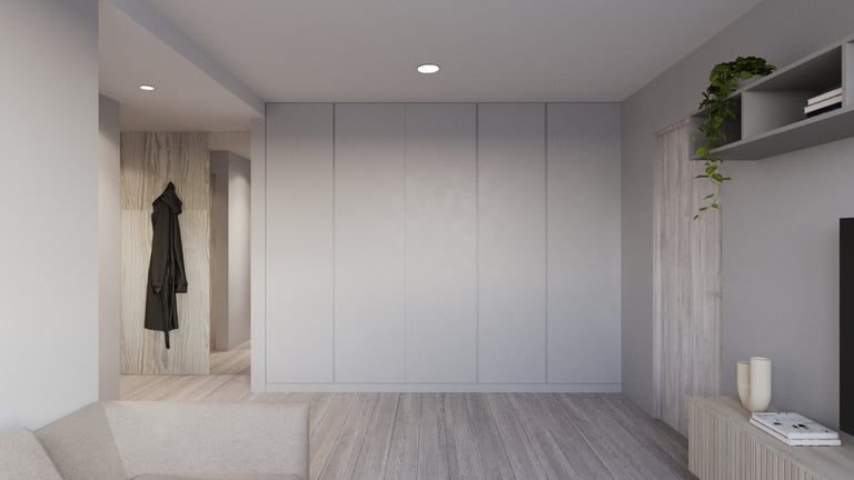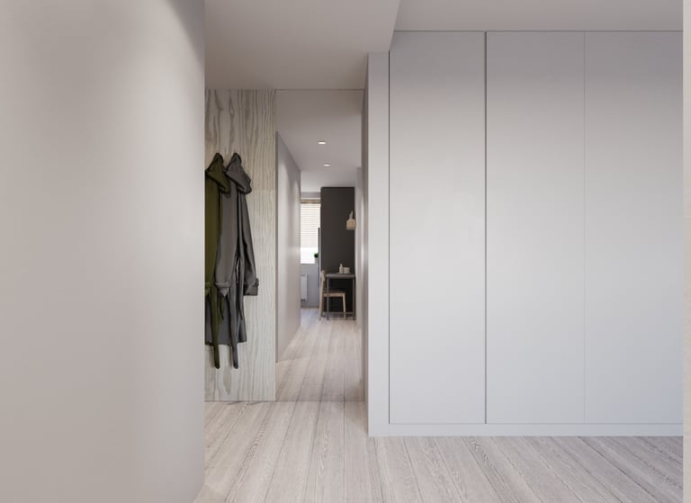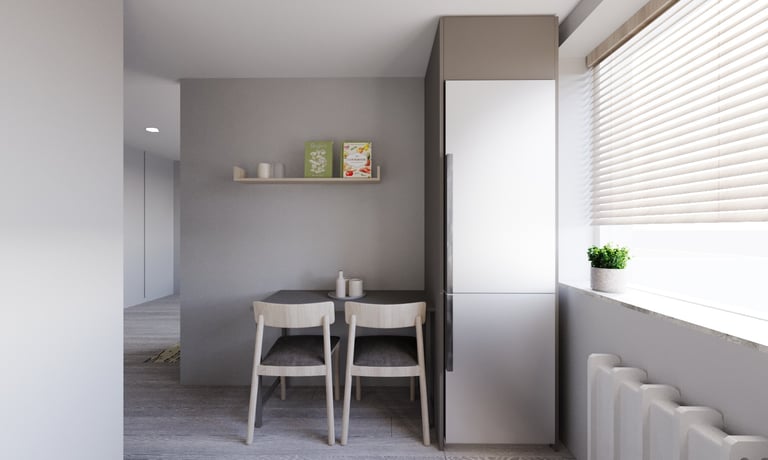 Nedidelio buto interjeras sukurtas atnaujinant senesnę erdvę, siekiant pritaikyti ją šiuolaikiniam gyvenimui ir išlaikyti nedidelį biudžetą. Pasirinktas minimalistinis stilius su šaltų atspalvių palete padeda sukurti švarią, tvarkingą ir vizualiai erdvesnę aplinką. Naudoti paprasti, funkcionalūs sprendimai ir nebrangios, bet kokybiškos medžiagos, kurios suteikia interjerui modernumo bei jaukumo be perteklinių detalių.